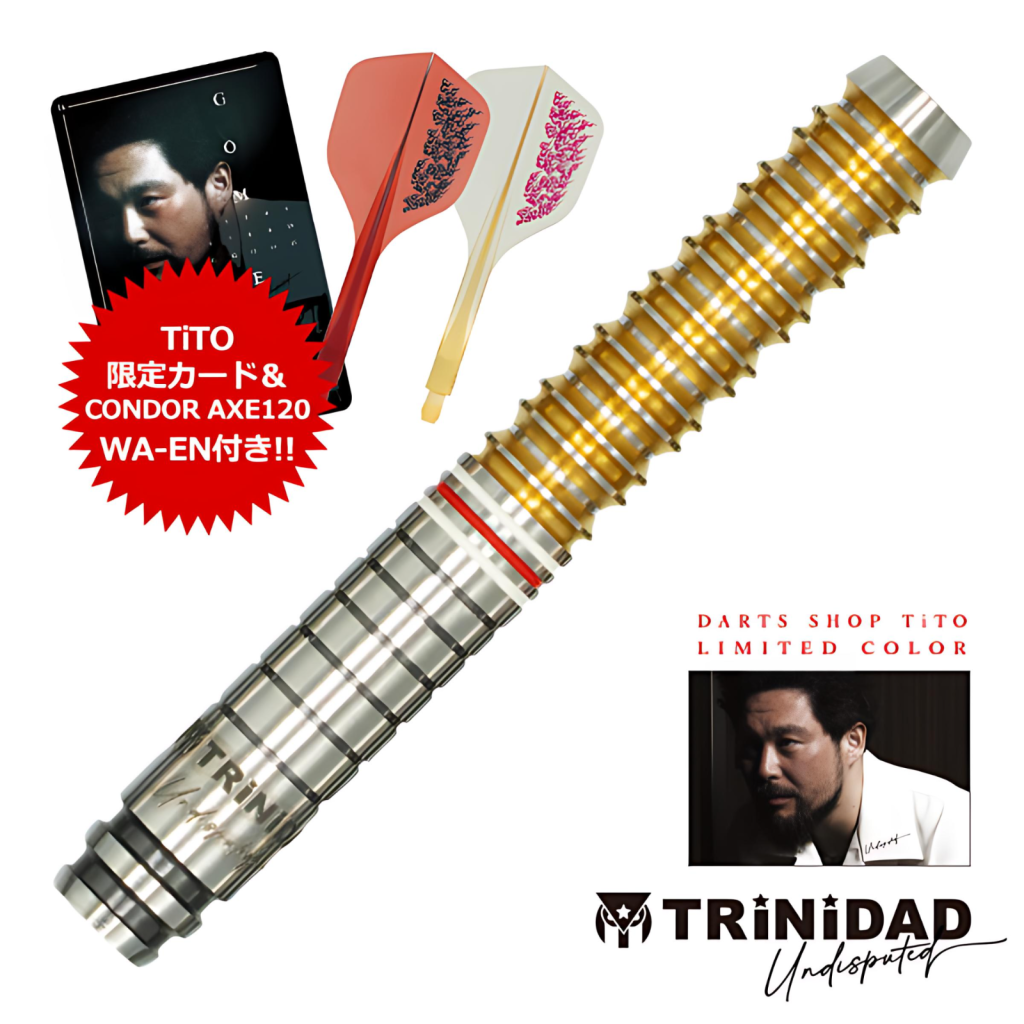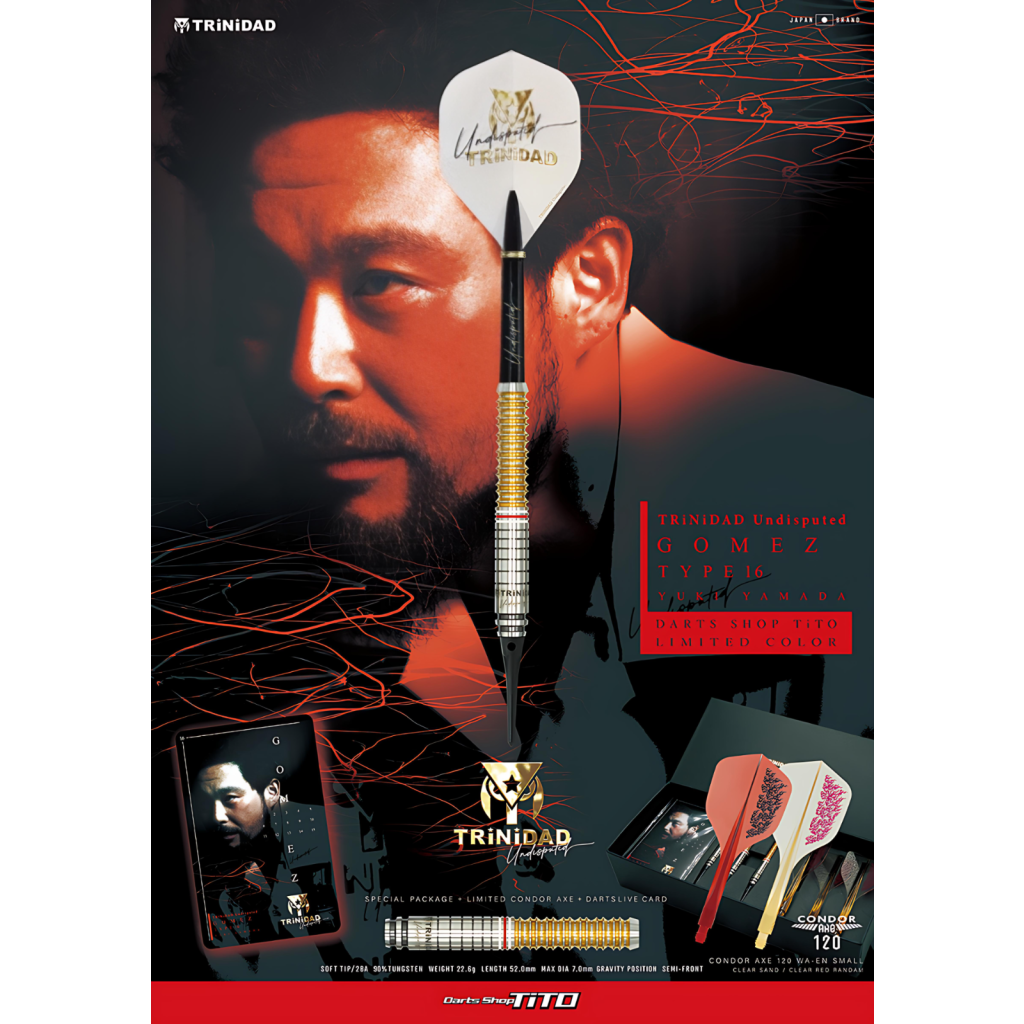 此乃 Trinidad x TITO 限定版,會附送山田勇樹限定版DARTSLIVE卡一張及一套Condor x AXE 120 和炎 山田勇樹選手款飛鏢翼一套