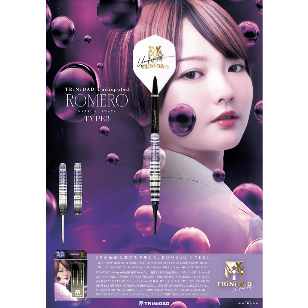 The TRiNiDAD UNDISPUTED ROMERO 3 is the third signature dart of Natsumi Iwata, designed to prioritize linear flight and stable grip compared to its predecessors.