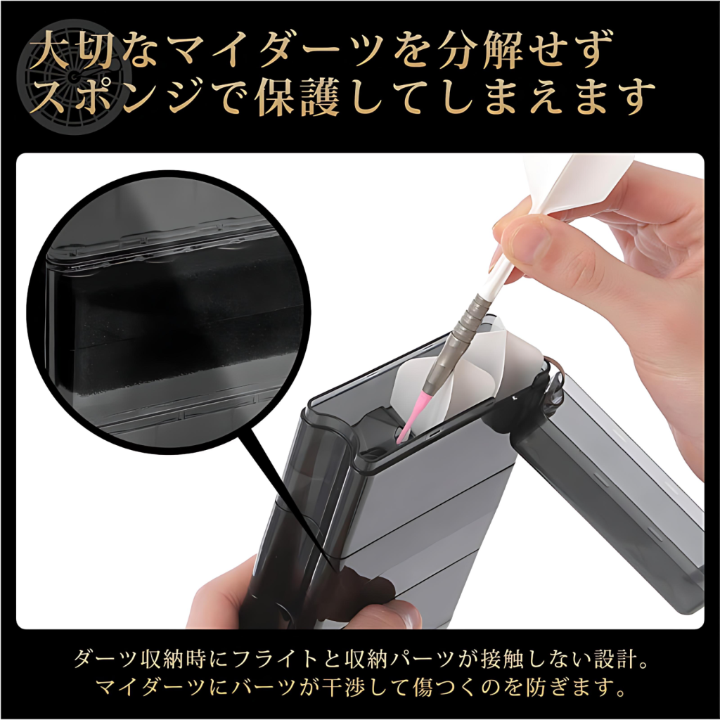 - 內部海綿固定:內置海綿可固定各種長度的飛鏢,解決樹脂收納盒中尖頭及桿子易脫落的問題,防止震動導致配件散落。