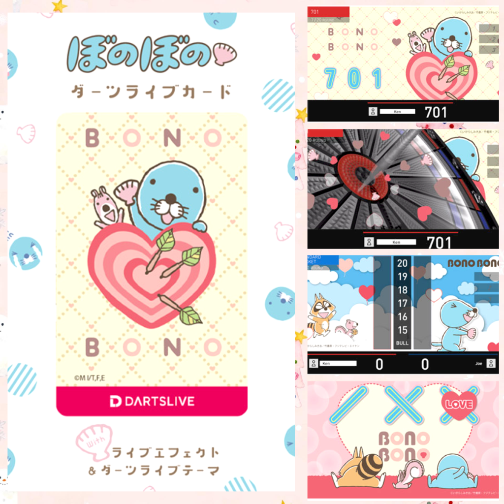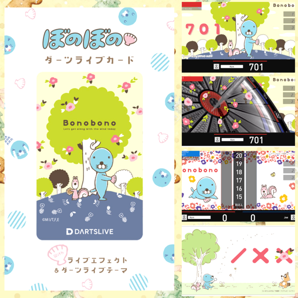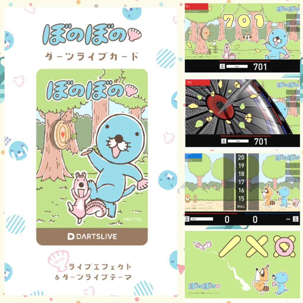 每張卡內建「LIVE EFFECT」+「DARTSLIVE主題」兩種特效, 無論DARTSLIVE3 定 DARTSLIVE2 機台,都可以欣賞超可愛演出!投鏢時ぼのぼの陪你一齊玩,療癒指數爆表~